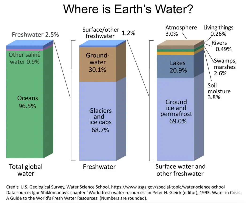 g. Introduce the concept of freshwater. Ask, how much of the water on Earth is freshwater? What is freshwater? Where can we find freshwater?